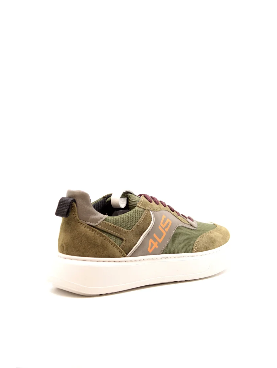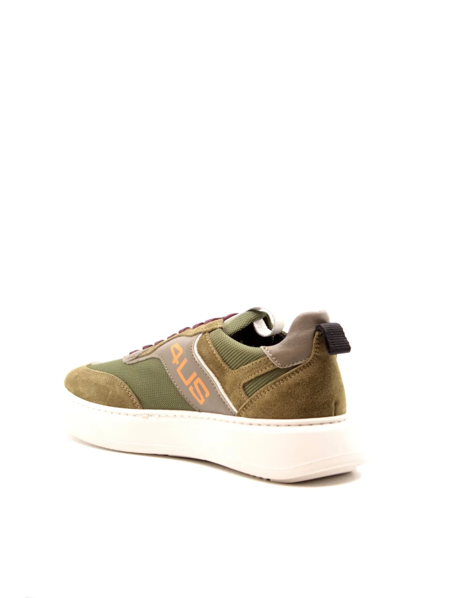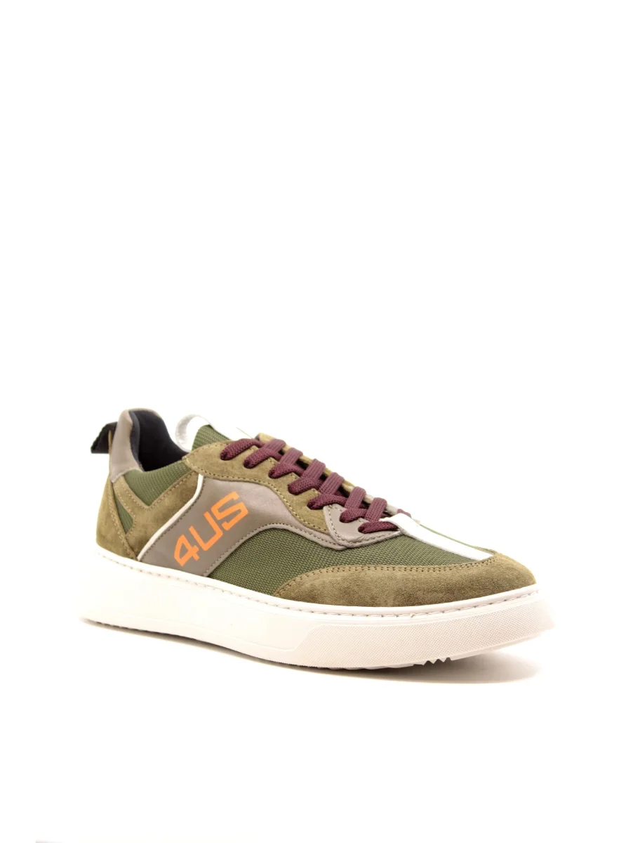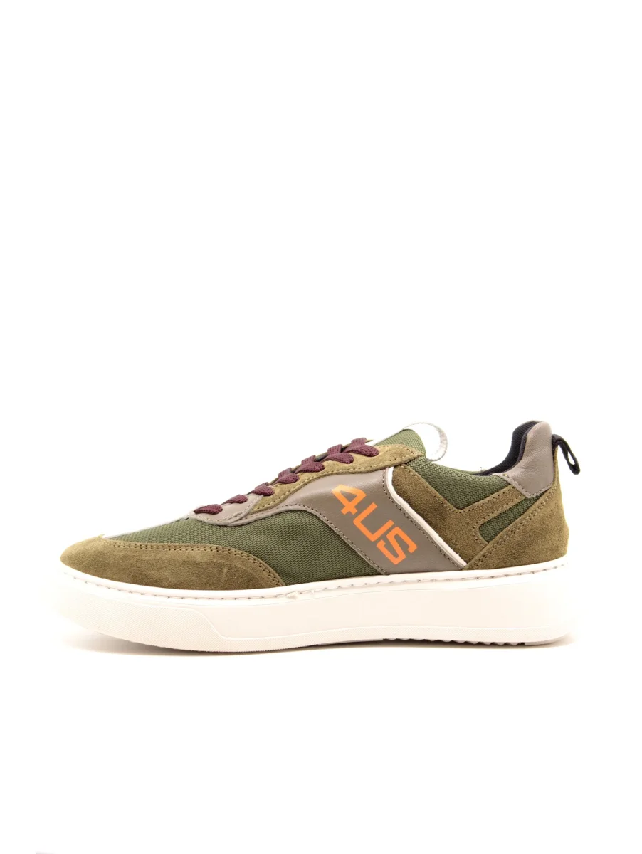 Sneaker in camoscio e tessuto di color verde. Fodera e linguetta in tessuto, collarino imbottito e linguetta in pelle bianca. Chiusura con lacci in cotone viola e tallone verde in camoscio. Dettagli laterali in pelle tortora e bianca con logo arancione. Suola in gomma bianca, alta 3,5 cm.